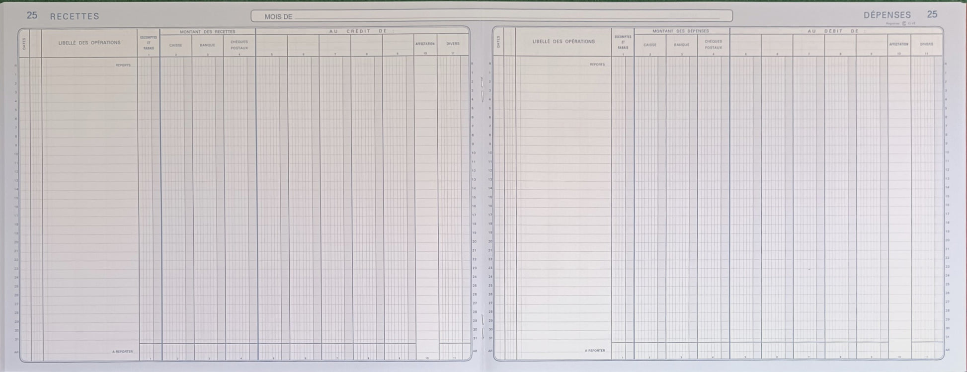 Caractéristiques : Piqûre tête imprimée à l'italienne 100 pages "Caisse, banque, chèques postaux, 6 colonnes de répartition par page recettes et dépenses"