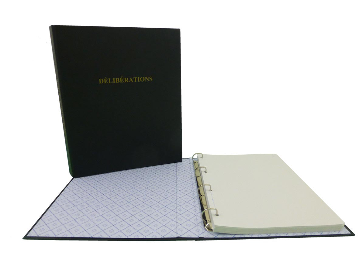 Caractéristiques : Reliure " Délibérations "avec recharge 100 feuillets numérotés et 6 garde-titres Mécanisme 4 anneaux en D